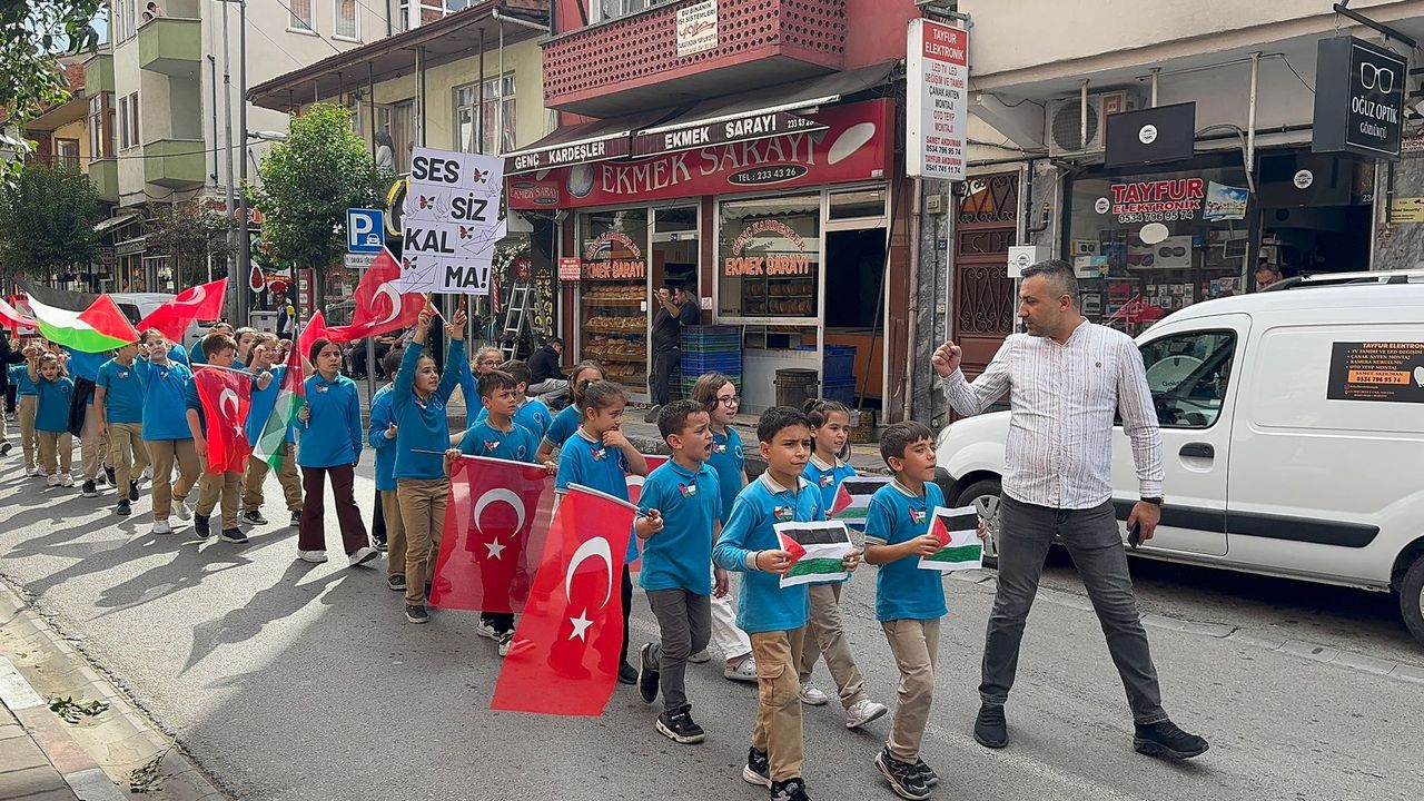 Okul idaresi ve öğretmenlerin gözetiminde gerçekleşen yürüyüşte, minik öğrencilerin taşıdığı bayraklar ve söyledikleri sloganlar, çevredeki vatandaşlardan da büyük destek gördü.