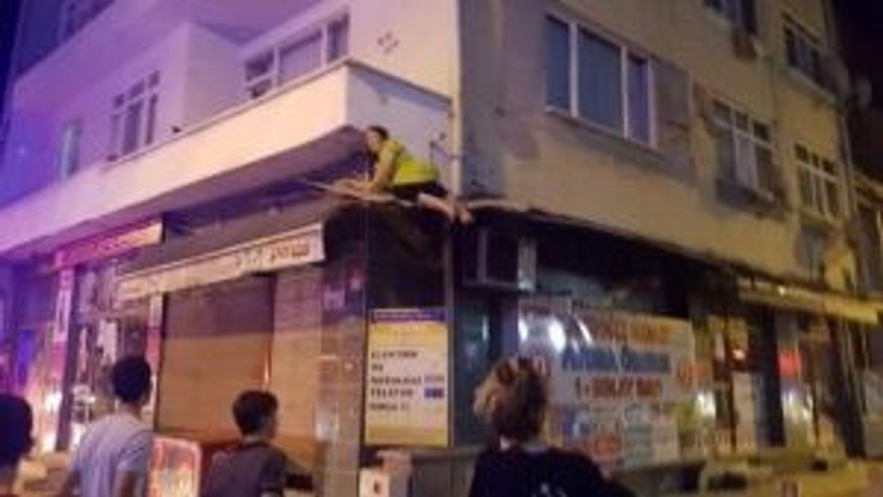 Evinin balkonundan düşen kadını balkonun altında bulunan tente kurtardı. Tentede duran kadını itfaiye ekibi, indirdi.
