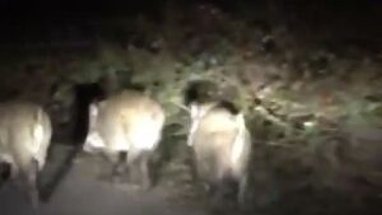 Bartın'da Karahüseyinli - Hacıhatipoğlu köyü yolunda ilerleyen bir aracın önüne çıkan domuz sürüsü cep telefonuyla görüntülendi.