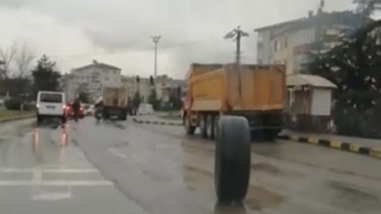 BARTIN'da, seyir halindeki kamyondan fırlayan lastiğin yol ortasında, araçların arasında ilerlediği anlar, cep telefonu kamerasıyla görüntülendi.