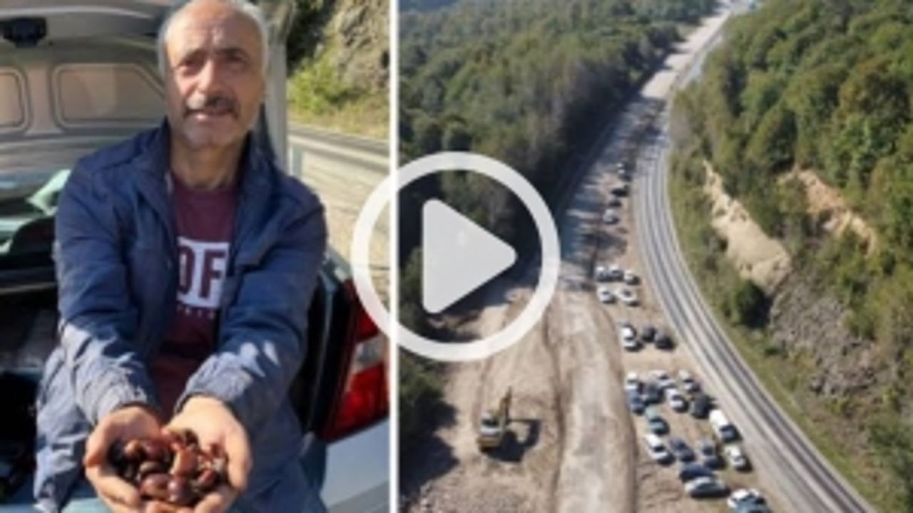 Köylüler, pazarda satmak için çoğu kişi de yemek için kestane toplarken, yol kenarına park edilen araçlarla uzun kuyruklar oluştu.