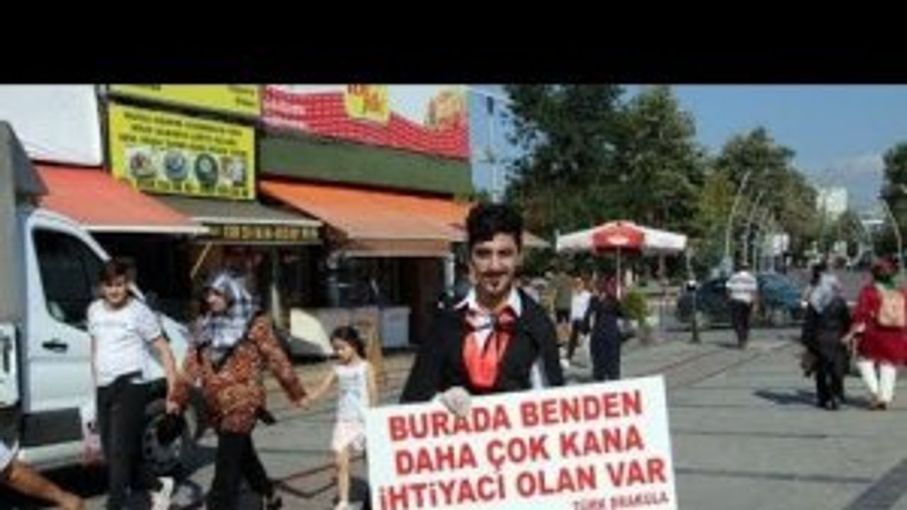Amatör tiyatro oyuncusu İsa Gülaçtı, kan bağışına dikkat çekmek için Drakula kılığına girip, 'Burada benden daha çok kana ihtiyacı olan var' yazılı dövizle Kızılay'ın mobil kan aracının önünde vatandaşları kan...