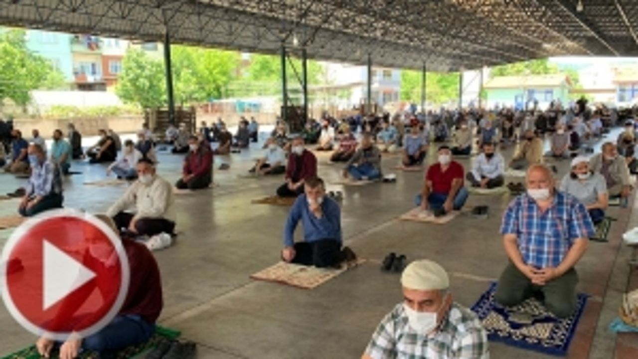 Bartın'ın Kozcağız beldesinde koronavirüs önlemleri kapsamında vatandaşlar kapalı pazaryerinde sosyal mesafe ve maske önlemleriyle saf tutarak Cuma namazı kıldı